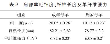 (1)羊毛纖維類型。本次調(diào)查的大尾寒羊因經(jīng)過改良,被毛同質(zhì)性較好,所測的83只羊中,成年母羊同質(zhì)毛所占比例為97.08%,周歲母羊同質(zhì)毛所占比例為84.42%。所有羊只肩側(cè)全部是同質(zhì)毛,因此本次分析對象主要以同質(zhì)毛為主。