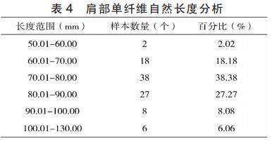 表6顯示,除了側(cè)部,周歲母羊其他部位的羊絨均較成年母羊的長。表7表明,長度范圍為25~65mm,平均長度為42.9mm。長度主體范圍為36~50mm,占82.81%,該批毛樣手排長度范圍較寬,長度分布較為集中,但總體來說長度偏短。對照山羊絨國家標(biāo)準(zhǔn),這些綿羊毛也都有較好的加工利用價值。