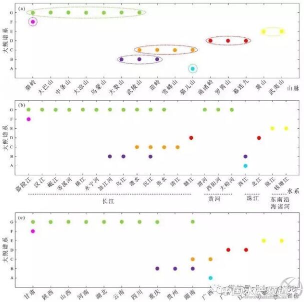 中國(guó)山脈、水系與省份大鯢遺傳譜系分布圖