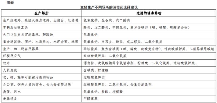 3.3.1 使用附表推薦的適當(dāng)消毒劑(按照說明書配制和使用),對(duì)生豬飼養(yǎng)棟舍、死豬暫存間、出豬間/臺(tái)、場(chǎng)區(qū)道路、飼料生產(chǎn)及存放間等進(jìn)行消毒。本指南推薦以下兩種方案,供參考。