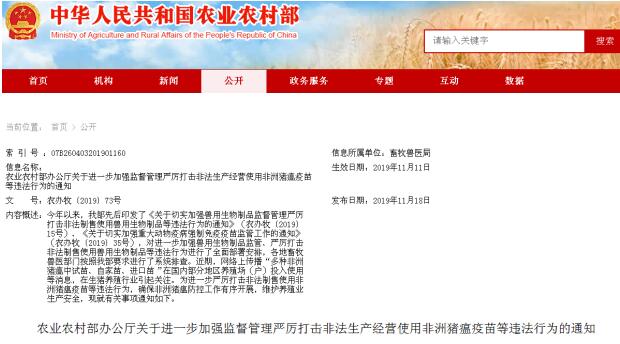 各地打擊非法生產(chǎn)銷售使用非洲豬瘟疫苗等違法行為的相關工作進展情況,要及時報我部畜牧獸醫(yī)局。