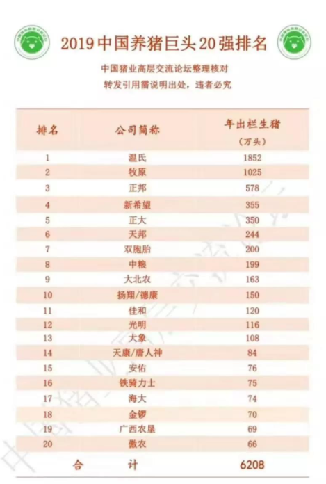 從表格上看,前20強企業(yè)總共22家,包括溫氏、牧原等耳熟能詳?shù)木揞^,也包括正大、天邦、正邦、唐人神等傳統(tǒng)強企,更有海大這種飼料巨頭進軍養(yǎng)殖的后起之秀。