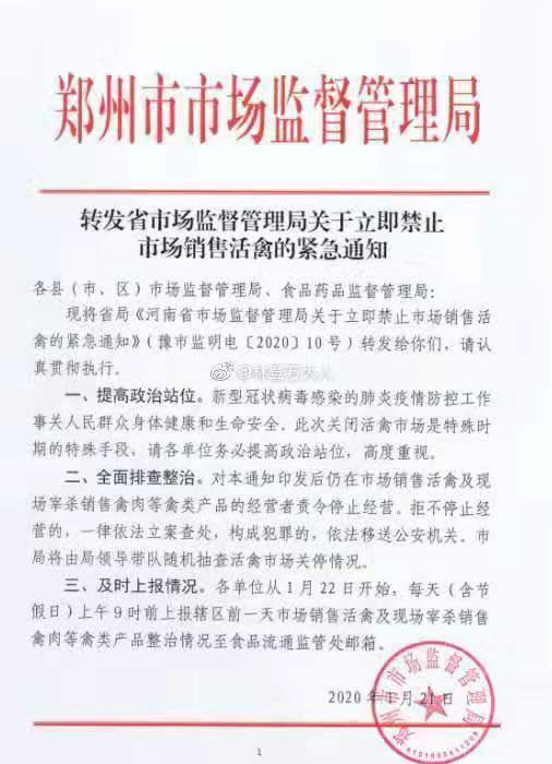 記者從鄭州市市場監(jiān)管局獲悉,當(dāng)天,鄭州市市場監(jiān)督管理局以紅頭文件形式轉(zhuǎn)發(fā)《河南省市場監(jiān)督管理局立關(guān)于立即禁止市場銷售活禽的緊急通知》(下稱通知)要求,各縣(市、區(qū))市場監(jiān)督管理局、食品藥品監(jiān)督管理局全面對(duì)農(nóng)貿(mào)市場等排查整治,對(duì)本通知印發(fā)后,仍在市場銷售活禽及現(xiàn)場宰殺銷售禽肉等禽類產(chǎn)品的經(jīng)營者,責(zé)令停止經(jīng)營。拒不停止經(jīng)營的,一律依法立案查處,構(gòu)成犯罪的,依法移送公安機(jī)關(guān),市局將由局領(lǐng)導(dǎo)帶隊(duì)隨機(jī)抽查活禽市場關(guān)停情況。