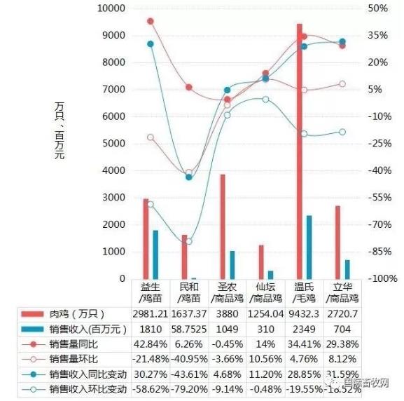 從數(shù)據(jù)中我們可以看出,肉雞銷量同比只有溫氏和益生在增加,而肉雞銷售量環(huán)比方面,12月份益生和民和停孵雞苗14天,1月孵化產(chǎn)能大幅增加。銷售收入方面,溫氏銷售收入仍然最高,達(dá)15.19億元。然而,無論從銷售收入同比還是環(huán)比,這六家收入下降明顯,仙壇的銷售收入環(huán)比下降最為厲害,下降了七成左右,這也能看出,隨著產(chǎn)能的增加,肉雞供不應(yīng)求現(xiàn)象目前已告一段落,肉雞價(jià)格下降明顯。