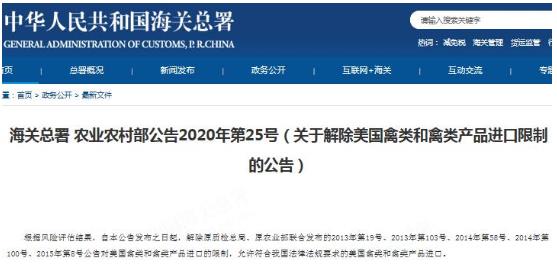 根據(jù)風(fēng)險評估結(jié)果,自本公告發(fā)布之日起,解除原質(zhì)檢總局、原農(nóng)業(yè)部聯(lián)合發(fā)布的2013年第19號、2013年第103號、2014年第58號、2014年第100號、2015年第8號公告對美國禽類和禽類產(chǎn)品進(jìn)口的限制,允許符合我國法律法規(guī)要求的美國禽類和禽類產(chǎn)品進(jìn)口。
