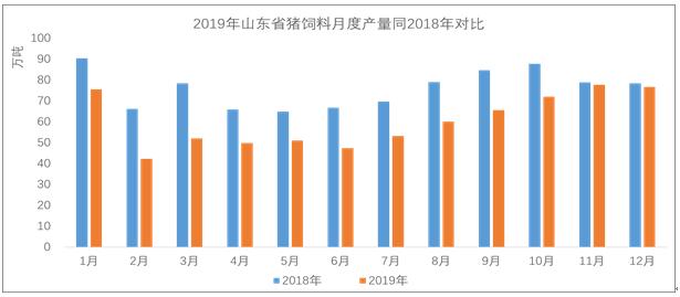 圖3 2019年山東省生豬飼料月度產(chǎn)量同2018年對比