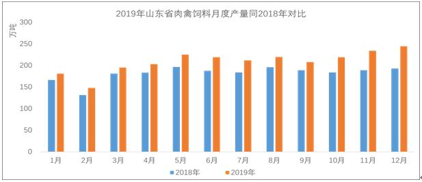 圖5 2019年山東省肉禽飼料月度產(chǎn)量同2018年對比