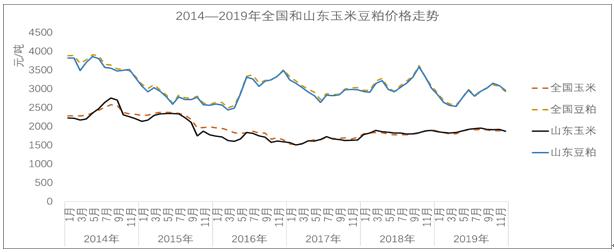 圖8 2014—2019年全國和山東玉米豆粕價格走勢