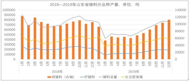 圖9 2018—2019年山東省生豬飼料分品種產(chǎn)量