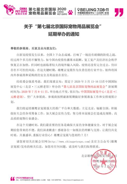經(jīng)組委會慎重考慮,我們鄭重宣布:原定于2020年3月13-16日在中國國際展覽中心(北京·三元橋老館)舉辦的“第七屆北京國際寵物用品展覽會”新展期時間為:2020年7月8-11日,舉辦地點不變,依舊為:中國國際展覽中心(北京·三元橋老館)。望廣大參展商、參觀商按照最新展期做好參展準備工作和安排觀展計劃。