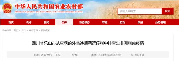 4月1日,農(nóng)業(yè)農(nóng)村部接到中國動物疫病預防控制中心報告,經(jīng)四川省動物疫病預防控制中心確診,在樂山市界內(nèi)的樂自高速大佛停車區(qū)查獲一輛來自外省的仔豬運輸車中排查出非洲豬瘟疫情。查獲時,該車輛共載有仔豬83頭,死亡1頭。