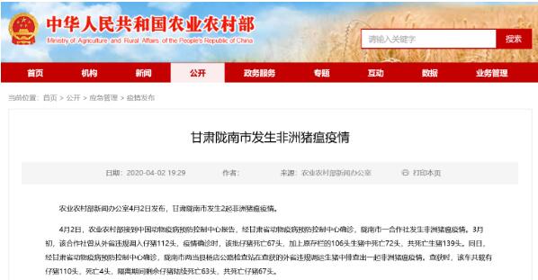 4月2日,農(nóng)業(yè)農(nóng)村部接到中國動(dòng)物疫病預(yù)防控制中心報(bào)告,經(jīng)甘肅省動(dòng)物疫病預(yù)防控制中心確診,隴南市一合作社發(fā)生非洲豬瘟疫情。3月初,該合作社曾從外省違規(guī)調(diào)入仔豬112頭,疫情確診時(shí),該批仔豬死亡67頭,加上原存欄的106頭生豬中死亡72頭,共死亡生豬139頭。同日,經(jīng)甘肅省動(dòng)物疫病預(yù)防控制中心確診,隴南市兩當(dāng)縣楊店公路檢查站在查獲的外省違規(guī)調(diào)運(yùn)生豬中排查出一起非洲豬瘟疫情。查獲時(shí),該車共載有仔豬110頭,死亡4頭,隔離期間剩余仔豬陸續(xù)死亡63頭,共死亡仔豬67頭。