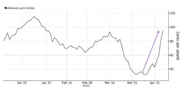 這點(diǎn)也反映在美國豬肉價(jià)格變化上:豬肉價(jià)格在過去4周上漲了一倍多。