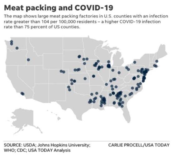 類似這種肉類加工廠關(guān)閉不是個(gè)案。媒體統(tǒng)計(jì)顯示,美國150個(gè)最大的肉類加工廠所在地均處于新冠疫情爆發(fā)的縣市。