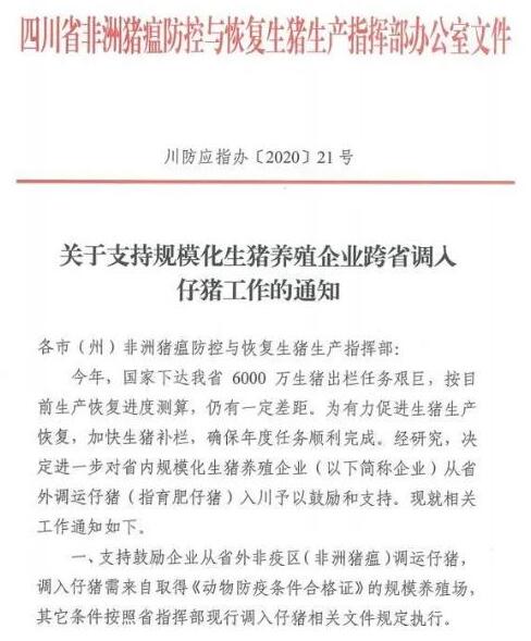 支持鼓勵(lì)企業(yè)從四川省外非疫區(qū)(非洲豬瘟)調(diào)運(yùn)仔豬, 調(diào)入仔豬需來自取得《動物防疫條件合格證》的規(guī)模養(yǎng)殖場,其它條件按照四川省指揮部現(xiàn)行調(diào)入仔豬相關(guān)文件規(guī)定執(zhí)行。