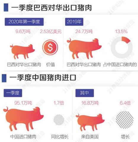 據(jù)巴西駐華大使館農(nóng)業(yè)處向21世紀(jì)經(jīng)濟(jì)報(bào)道記者提供的數(shù)據(jù),今年第一季度,巴西對(duì)華出口豬肉9.6萬噸,價(jià)值2.53億美元。2019年巴西對(duì)華出口了24.7萬噸豬肉,占中國(guó)進(jìn)口豬肉的13.5%。