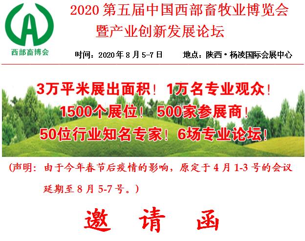 “第五屆中國西部畜牧業(yè)博覽會暨產(chǎn)業(yè)創(chuàng)新發(fā)展論壇” 將于2020年5月5-7日在陜西·楊凌繼續(xù)舉辦。組委會在秉承上屆成功經(jīng)驗的同時,將加大組織和宣傳力度,廣泛邀請和組織國內(nèi)外知名企業(yè)參展,更全面的展示畜牧業(yè)生產(chǎn)中應用的新技術(shù)、新產(chǎn)品、新設備、新工藝、新模式,加強行業(yè)間的交流合作。創(chuàng)新發(fā)展論壇將邀請國內(nèi)外知名專家、學者、名企領(lǐng)導圍繞國家產(chǎn)業(yè)政策,目前形勢、發(fā)展趨勢、存在問題、應對策略,進行高水平的技術(shù)宣講、互動交流。
