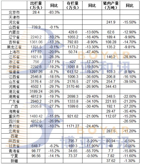 畜禽養(yǎng)殖深度調(diào)整。受非洲豬瘟疫情影響,生豬出欄3189.24萬頭,下降26.9%;牛出欄109.52萬頭,增長(zhǎng)1.1%;羊出欄615.93萬只,增長(zhǎng)1.1%;家禽出籠59394.01萬只,增長(zhǎng)11.5%;禽蛋產(chǎn)量178.75萬噸,增長(zhǎng)4.2%。