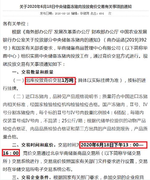 6月16日,華儲網(wǎng)發(fā)布《關(guān)于2020年6月18日中央儲備凍豬肉投放競價交易有關(guān)事項的通知》,6月18日將出庫投放競價交易1萬噸中央儲備凍豬肉。