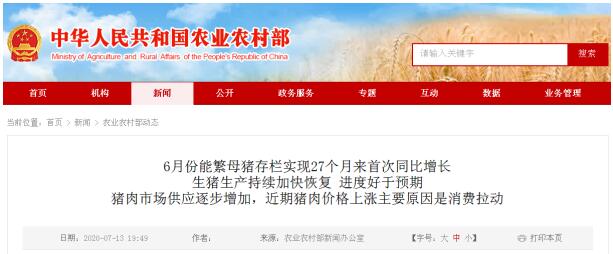 該負(fù)責(zé)人表示,6月份以來(lái)豬肉市場(chǎng)價(jià)格上漲屬于消費(fèi)拉動(dòng)型上漲,供需兩方面都在增加,但消費(fèi)增加更快。從供應(yīng)方面看,3月份以來(lái),生豬出欄量連續(xù)4個(gè)月環(huán)比增長(zhǎng),其中6月份出欄量比5月增長(zhǎng)6.5%,比2月增長(zhǎng)36.7%。今年前5個(gè)月進(jìn)口豬肉172.4萬(wàn)噸,同比增長(zhǎng)146.2%。從消費(fèi)方面看,隨著新冠肺炎疫情得到有效控制,餐飲業(yè)恢復(fù)經(jīng)營(yíng),工廠復(fù)工,學(xué)校復(fù)課,豬肉消費(fèi)潛力得到充分釋放。據(jù)國(guó)家統(tǒng)計(jì)局?jǐn)?shù)據(jù),3月份全國(guó)餐飲收入同比下降46.8%,5月份降幅已收窄至18.9%。預(yù)計(jì)后期餐飲業(yè)豬肉消費(fèi)仍將保持增長(zhǎng)勢(shì)頭。一般來(lái)說(shuō),每年6-9月份豬肉價(jià)格都會(huì)出現(xiàn)季節(jié)性上漲,今年疊加新冠肺炎疫情得到有效控制后的消費(fèi)增長(zhǎng),上漲壓力可能會(huì)更大。另外,南方部分地區(qū)強(qiáng)降雨對(duì)生豬生產(chǎn)及產(chǎn)品調(diào)運(yùn)產(chǎn)生了一定的影響,也推高了局部地區(qū)豬肉價(jià)格。