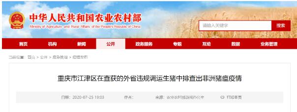 7月24日,農業(yè)農村部接到中國動物疫病預防控制中心報告,經(jīng)重慶市動物疫病預防控制中心確診,在江津區(qū)珞璜高速公路服務區(qū)查獲的外省違規(guī)調運生豬中排查出非洲豬瘟疫情。查獲時,該批生豬共24頭,發(fā)病4頭,死亡1頭。