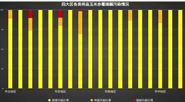 表1結(jié)果顯示,飼料及各類原料中嘔吐毒素均未出現(xiàn)超標污染,但從均值和中值來看,DDGS類原料中值偏高,須引起重視。根據(jù)圖1區(qū)域分析結(jié)果,華東和華南地區(qū)嘔吐毒素以DDGS中度污染為主,均值分別為3126.2 μg/kg、2770.5 μg/kg。華中地區(qū)50% 左右的麩皮嘔吐毒素為中度污染(缺乏該地區(qū)餅粕類以及DDGS類樣品)。華北地區(qū)嘔吐毒素以餅粕類原料中度污染為主,均值為343.8 μg/kg,DDGS、麩皮和玉米及其副產(chǎn)物等為輕度污染,同時該地區(qū)飼料中亦檢出大于30% 的中度污染,該地區(qū)應注意餅粕類原料中嘔吐毒素帶來的風險。