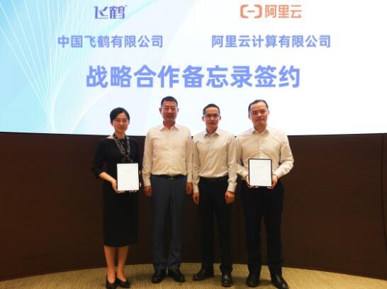 中國(guó)飛鶴與阿里云戰(zhàn)略合作簽約嘉賓合影,從左到右分別為:中國(guó)飛鶴副總裁梁愛(ài)梅、中國(guó)飛鶴董事長(zhǎng)冷友斌、阿里云智能總裁張建鋒 、阿里巴巴集團(tuán)副總裁肖利華