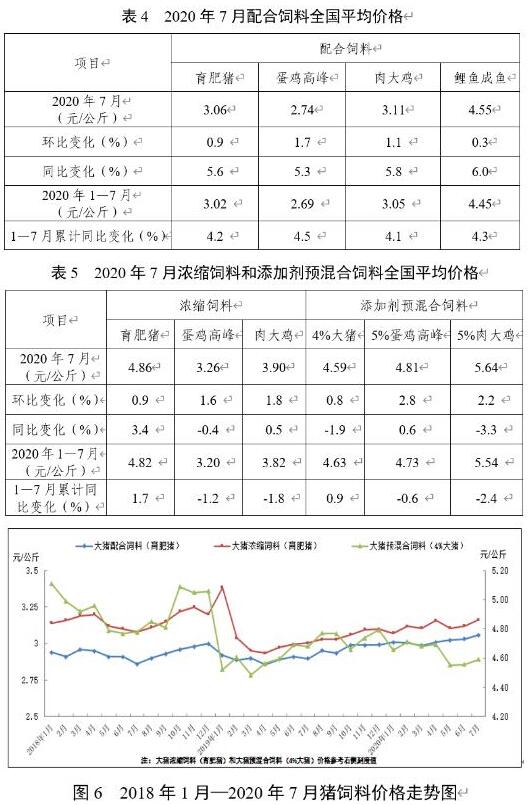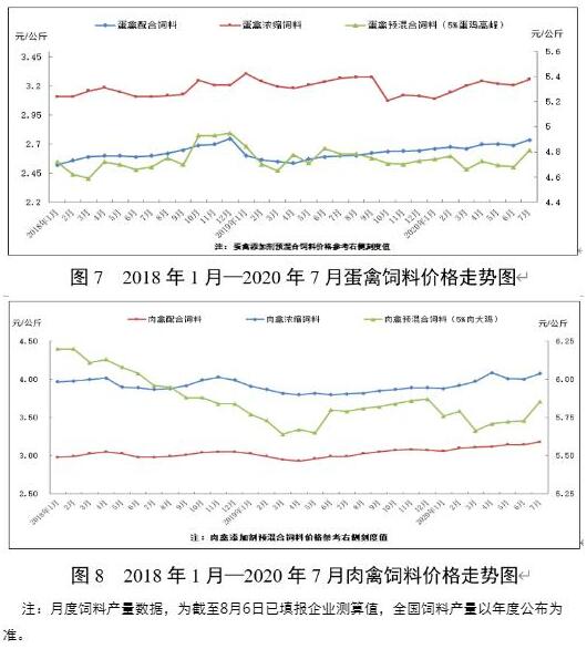 7月份,因玉米價(jià)格持續(xù)上漲,帶動(dòng)麩皮等能量飼料原料價(jià)格上漲,配合飼料價(jià)格普遍上漲,主要飼料品種價(jià)格比上年同期上漲5.3—6.0個(gè)百分點(diǎn)。豆粕價(jià)格偏強(qiáng)震蕩,帶動(dòng)蛋白飼料原料價(jià)格不同程度上漲,除蛋禽濃縮料同比小幅下降外,其他濃縮飼料價(jià)格比上年同期上漲0.5—3.4個(gè)百分點(diǎn)。預(yù)混合飼料同比以小幅下降為主。