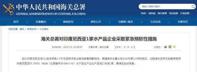 據(jù)海關(guān)總署官方網(wǎng)站18日消息,因從印度尼西亞進口1批凍帶魚1個外包裝樣本檢出新冠病毒核酸陽性,根據(jù)海關(guān)總署公告2020年第103號的規(guī)定,全國海關(guān)自即日起暫停接受印度尼西亞PT.PUTRI INDAH(注冊編號為CR010-02)水產(chǎn)品生產(chǎn)企業(yè)產(chǎn)品進口申報1周,期滿后自動恢復。