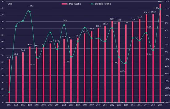 從中國國家統(tǒng)計局發(fā)布數(shù)據(jù)來看,2019年全國家禽出欄146.41億只,比上年增加15.51億只,增長11.9%;禽肉產量2239萬噸,增加245萬噸,增長12.3%;禽蛋產量3309萬噸,增加181萬噸,增長5.8%;2019年末全國家禽存欄65.22億只,同比增加4.85億只,增長8.0%。以此來看,家禽生產在2019年取得較大增長,創(chuàng)下自1997年以來20余年的歷史最高點(圖1)。