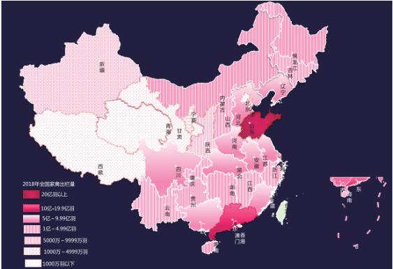 從家禽出欄地域分布圖來看,年出欄量在5億羽以上的家禽養(yǎng)殖大省總數(shù)達到11個,主要聚集于華東、華南、華中地區(qū),西南的四川、華北的河北出欄量均在5億羽以上;出欄量在1億羽到5億羽的省份也有11個,主要有云南、貴州及湖南、江西等(見圖2)。比較來看,除北京、天津、上海這三個直轄市外,西北的新疆、甘肅、陜西等地以及西藏的年出欄家禽低于其他地區(qū)。