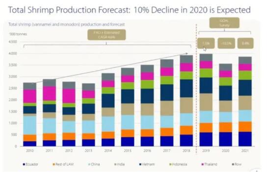 據(jù)GAA的受訪者稱,2019年全球蝦產(chǎn)量增長了1.5%,或多或少恰好達(dá)到400萬噸,隨后又下降了10.5%,至剛好350萬噸多一點(diǎn)。然后,2021年將有8.4%的恢復(fù),再次接近4百萬。