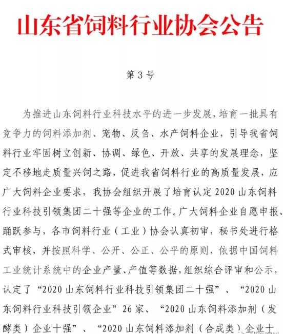 2020 山東飼料添加劑(發(fā)酵類)企業(yè)十強(qiáng)
