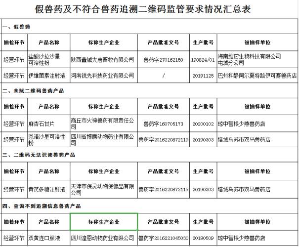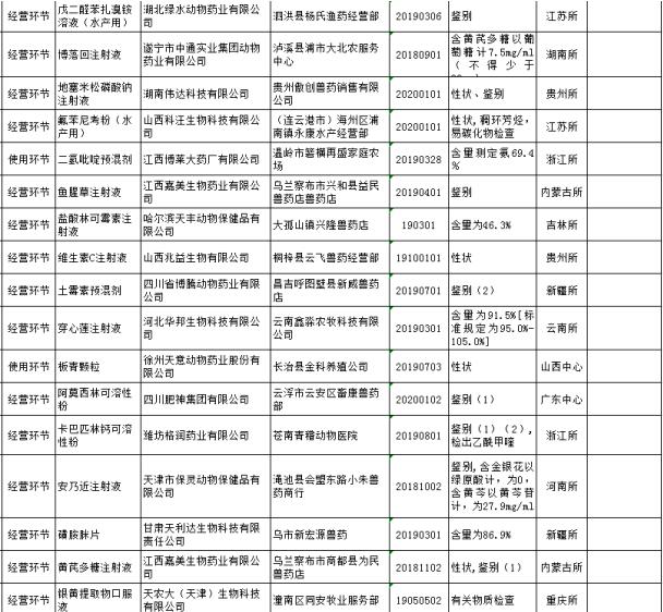 經(jīng)地方畜牧獸醫(yī)主管部門調(diào)查、核實(shí)和查處,2019年度和2020年第一期獸藥質(zhì)量監(jiān)督抽檢情況通報(bào)中列為重點(diǎn)監(jiān)控企業(yè)的黑龍江省匯豐動(dòng)物保健品有限公司、重慶泰通動(dòng)物藥業(yè)有限公司、上海瑞博(沈丘)生物工程有限公司已完成立案查處并整改合格。