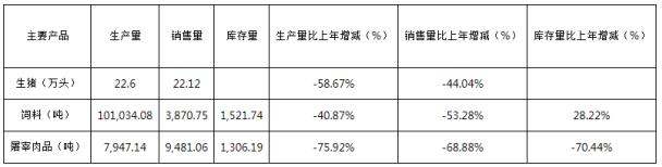 注:生豬生產(chǎn)量22.60萬頭,其中,以活豬銷售21.29萬頭,以肉品銷售1.31萬頭。生豬銷售量22.12萬頭,其中,自有活豬銷售21.29萬頭,外購活豬貿(mào)易銷售0.83萬頭。