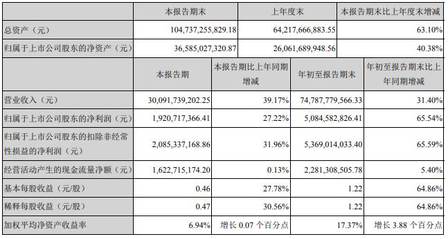 新希望11月2日公布2020年第三季度報告全文。公司前三季度實現(xiàn)營業(yè)收入747.88億元,同比增31.4%;實現(xiàn)凈利潤50.85億元,同比增長65.54%;其中第三季度實現(xiàn)營業(yè)收入300.92億元,同比增39.17%,凈利潤19.21億元,增長27.22%。