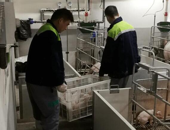 圖:古嶺生豬基地工作人員在搬運(yùn)仔豬