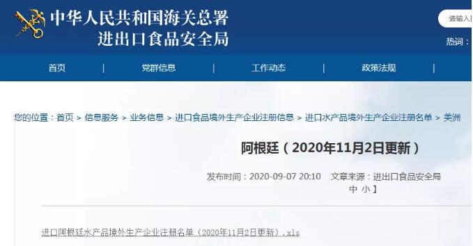 11月2日,海關(guān)總署更新進(jìn)口阿根廷水產(chǎn)品準(zhǔn)入名單。