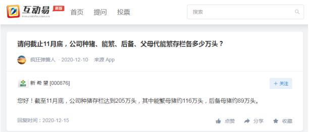新希望:截至11月底,公司種豬存欄達(dá)到205萬(wàn)頭