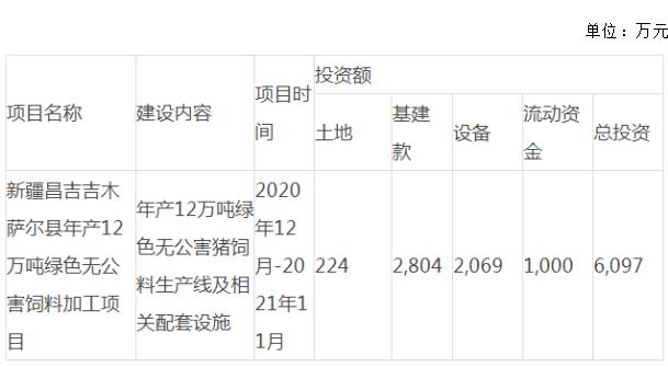 公司全資子公司新疆大北農(nóng)牧業(yè)科技有限公司(以下簡(jiǎn)稱“新疆大北農(nóng)”)擬在新疆自治區(qū)昌吉州吉木薩爾縣投資建設(shè)年產(chǎn)12萬噸綠色無公害飼料加工項(xiàng)目。該項(xiàng)目為一期工程,項(xiàng)目擬征地不低于80畝,全部用于生豬飼料生產(chǎn),建成后年產(chǎn)9萬噸全價(jià)配合(顆粒)飼料,3萬噸濃縮料。項(xiàng)目計(jì)劃由新疆大北農(nóng)牧業(yè)科技有限公司擬設(shè)立的下屬全資子公司新疆北庭大北農(nóng)農(nóng)牧科技有限責(zé)任公司(以下簡(jiǎn)稱“北庭大北農(nóng)”)為建設(shè)實(shí)施主體。本次對(duì)外投資的資金來源于北庭大北農(nóng)自有資金及銀行貸款。