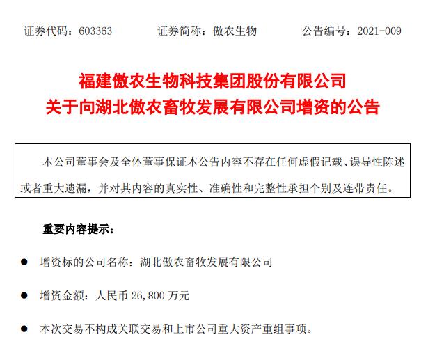 公告稱,本次增資系為了滿足下屬公司湖北傲農(nóng)畜牧同步配置資本金需要,增強(qiáng)子公司資本實(shí)力,有助于湖北傲農(nóng)畜牧順利申請銀行融資,促進(jìn)豬場工程項(xiàng)目加快建設(shè),符合公司整體利益,有利于公司做大做強(qiáng)。