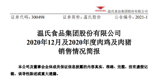 溫氏食品集團股份有限公司(以下簡稱“公司”)2020年12月銷售肉雞9,386.62萬只(含毛雞、鮮品和熟食),收入24.19億元,毛雞銷售均價13.13元/公斤,環(huán)比變動分別為3.31%、8.43%、4.54%,同比變動分別為-0.48%、2.98%、1.23%。