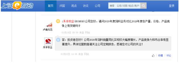 近日,有投資者向禾豐牧業(yè)提問,請問2020年度飼料業(yè)務對比2019年度在產量、價格、產品競爭上有突破嗎?