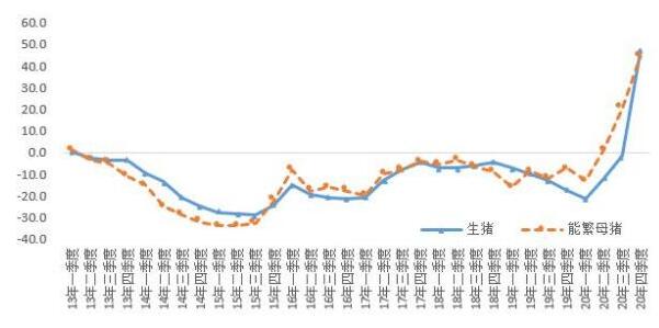 2013年以來生豬和能繁母豬存欄同比增減幅度(%)