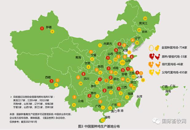 綜合中國農(nóng)業(yè)部種畜禽許可管理系統(tǒng)及企業(yè)官方發(fā)布的數(shù)據(jù)來看:目前,全國共有種蛋雞場734家,其中原種/祖代場33家,祖代場46家,父母代場655家。整體來看,種蛋雞場主要分布在北方且聚集在東部,以北京、河北、江蘇、安徽、山東、四川、湖北以及東北三省較多(見圖3)。