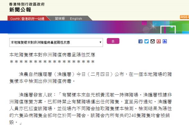 香港特區(qū)政府4日發(fā)布新聞公報(bào),香港特區(qū)政府漁農(nóng)自然護(hù)理署(漁護(hù)署)4日公布,在一個(gè)本地豬場的豬只樣本中檢測出非洲豬瘟病毒。