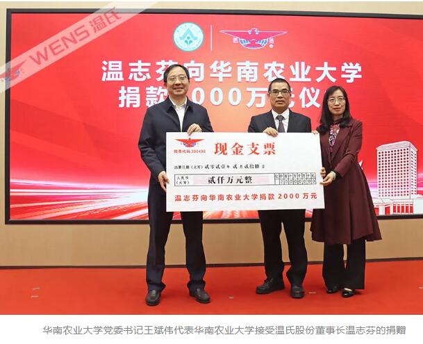 在捐贈儀式上,王斌偉代表華南農(nóng)業(yè)大校對溫志芬董事長個人的慷慨解囊表示崇高的敬意和由衷的感謝。