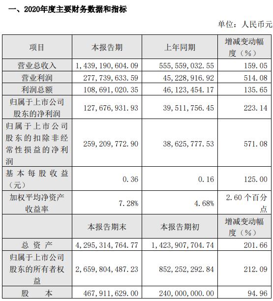 截止2020年末,公司總資產(chǎn)429,531.48萬元,較上年同期增加 201.66%;歸屬于上市公司股東的所有者權(quán)益 265,980.45萬元,較上年同期增加212.09%;歸屬于上市公司股東的每股凈資產(chǎn)4.96元,較上年同期增加41.31%。