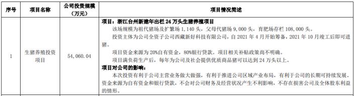 新希望3月13日公告,公司第八屆董事會第三十三次會議審議通過了“關于繼續(xù)加大生豬養(yǎng)殖投資的議案”:為落實公司生豬產(chǎn)業(yè)發(fā)展戰(zhàn)略,促進公司養(yǎng)殖業(yè)務的發(fā)展,公司決定繼續(xù)加大在生豬養(yǎng)殖業(yè)務的投資力度,在浙江臺州新建年出欄24萬頭生豬養(yǎng)殖項目,該場規(guī)模為祖代豬場及擴繁場共計1,140頭,父母代豬場共計9,000頭,存欄108,000頭育肥場。總投資54,060.04萬元,其中固定資產(chǎn)投資41,436.04萬元,生物性資產(chǎn)和流動資金投資12,624.00萬元。