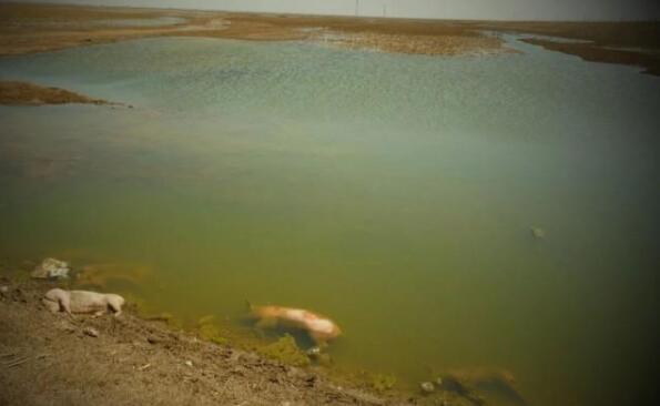 再向西不遠(yuǎn)處,展旦召蘇木境內(nèi)“國堤”內(nèi)側(cè)的一個取水口處,2頭死豬泡在水中。